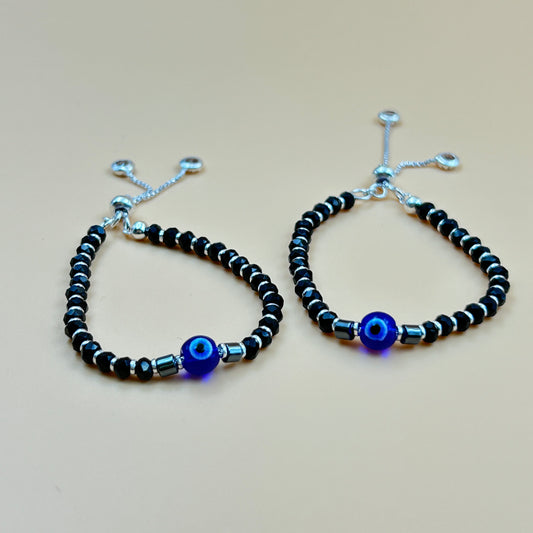 Silver Evil Eye Baby Bracelet - Adjustable Black Beaded Bracelet / Kada